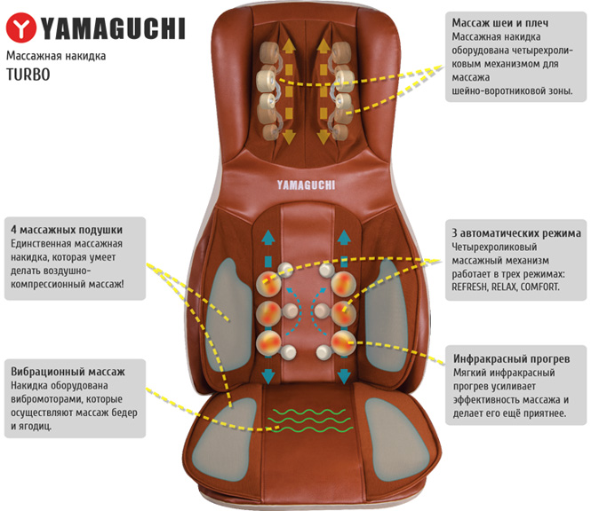 Отзыв: Приобрела эту накидку в основном потому, что она полноценно шею массирует . Все таки подобрать удобную, чтобы все устраивало очень трудно, а здесь и спина и полноценный массаж шеи, делаешь чуть выше или ниже, как удобно. Массаж неслабый, но и нежесткий. Есть еще аэро подушки, но я не люблю, поэтому не включаю. Доверяю фирме Ямагучи, уже знакомые брали, довольны остались, я тоже